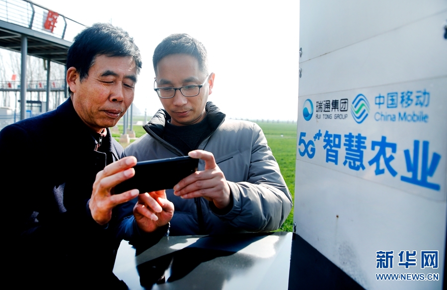 2月27日,河南省開封市尉氏縣張市鎮(zhèn)萬畝高標(biāo)準(zhǔn)農(nóng)田,技術(shù)人員在利用5G手機在對小麥進行噴灌管理。