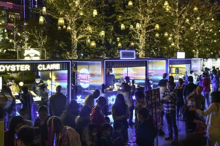 市民在廣州夜經(jīng)濟集聚區(qū)天德廣場天德快閃街品嘗美食(2021年12月10日攝)。新華社記者 劉大偉 攝
