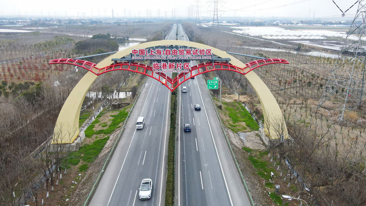 S2滬蘆高速上的中國(上海)自由貿(mào)易試驗區(qū)臨港新片區(qū)“海鷗門”(2022年2月10日攝,無人機照片)。新華社記者 方喆 攝