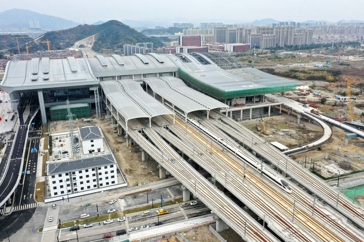 從浙江嵊州新昌站開出的杭臺高鐵首發(fā)列車停靠臺州站后駛出,開往溫嶺方向(2022年1月8日攝,無人機照片)。新華社記者 黃宗治 攝