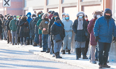 近期,加拿大疫情仍在持續(xù)蔓延。圖為1月14日,在加拿大安大略省多倫多,人們排隊(duì)領(lǐng)取免費(fèi)發(fā)放的新冠病毒檢測(cè)套裝。