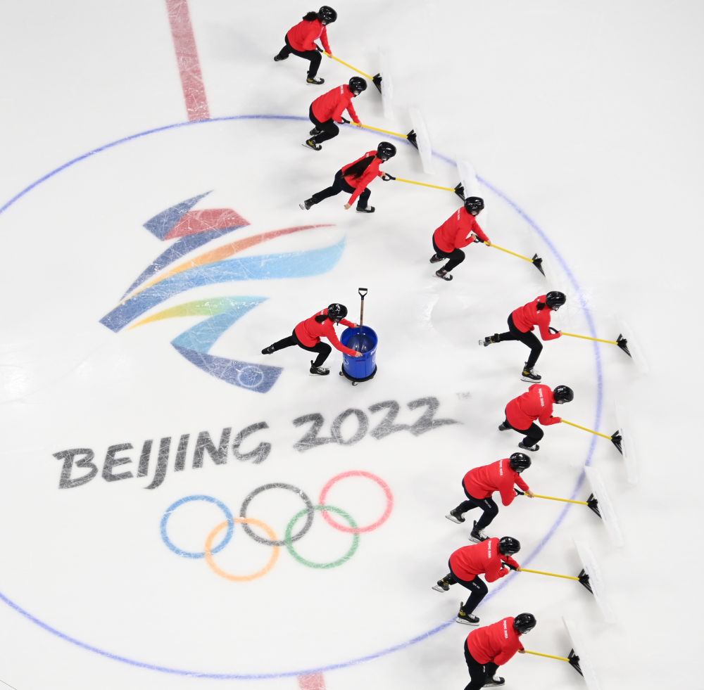 五棵松體育中心工作人員在冰球比賽間隙清理冰面。