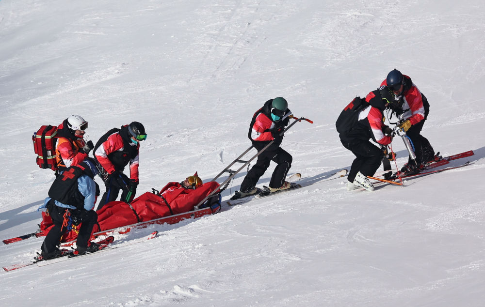 在延慶國家高山滑雪中心,高山滑雪醫(yī)療隊隊員用雪橇船將選手帶離賽道救治。