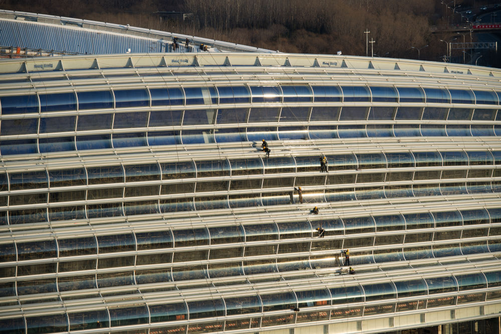 施工人員在實現(xiàn)封頂封圍的國家速滑館“冰絲帶”現(xiàn)場工作。
