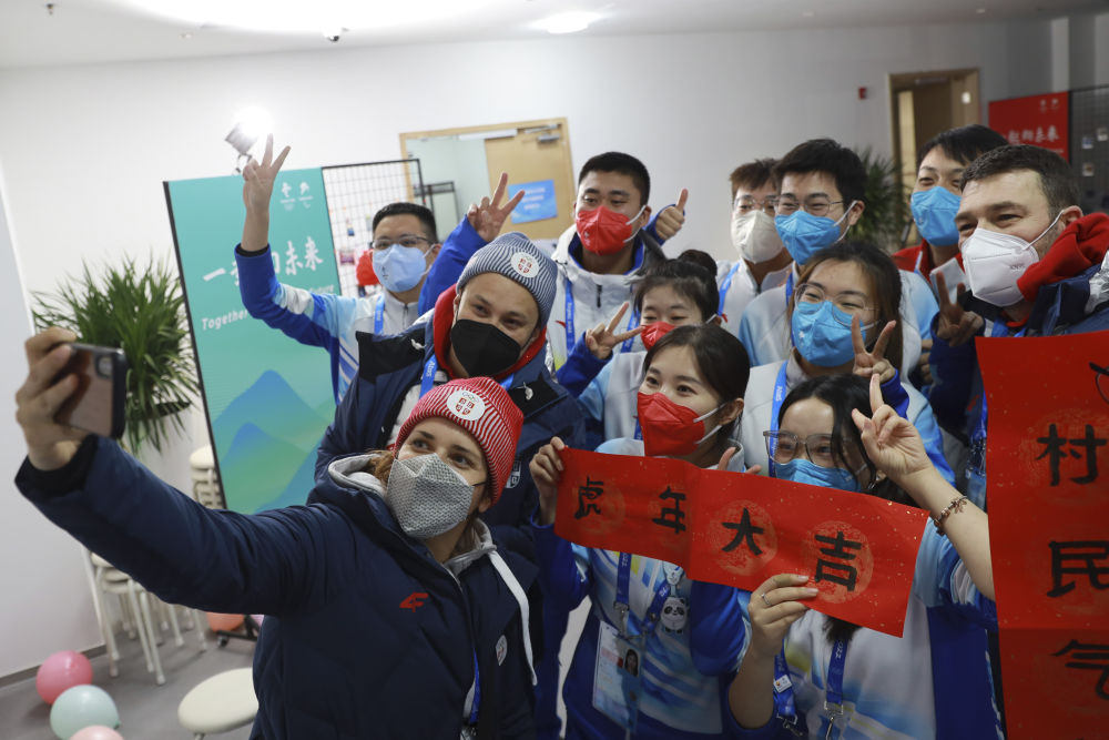 除夕當天,塞爾維亞代表團成員和志愿者在延慶冬奧村合影留念。