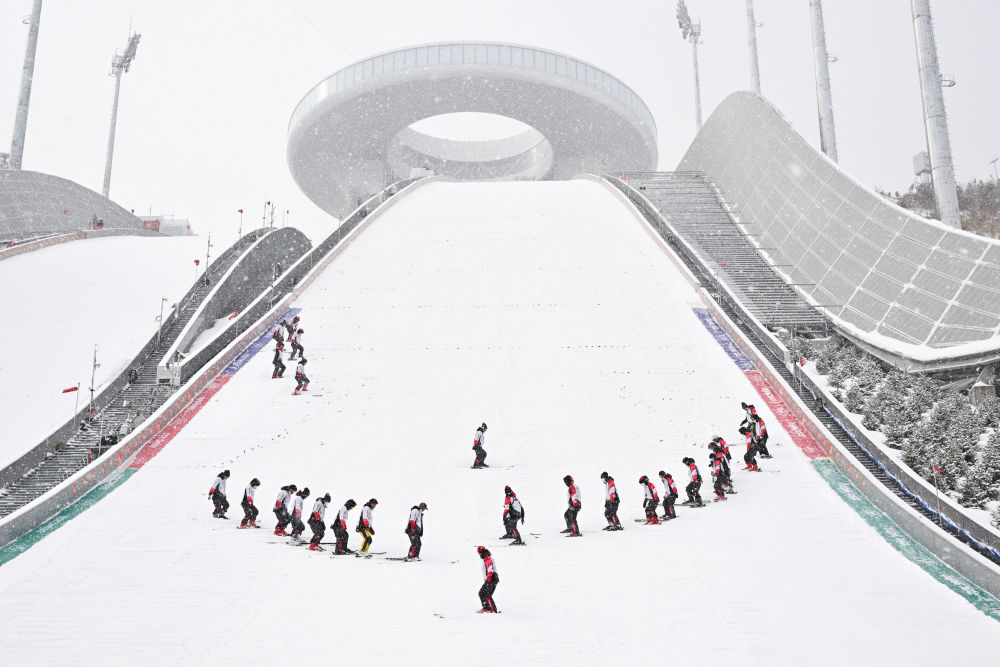 工作人員在國家跳臺滑雪中心“雪如意”整理賽道。“雪如意”的設計借鑒了傳統(tǒng)文化符號“如意”。