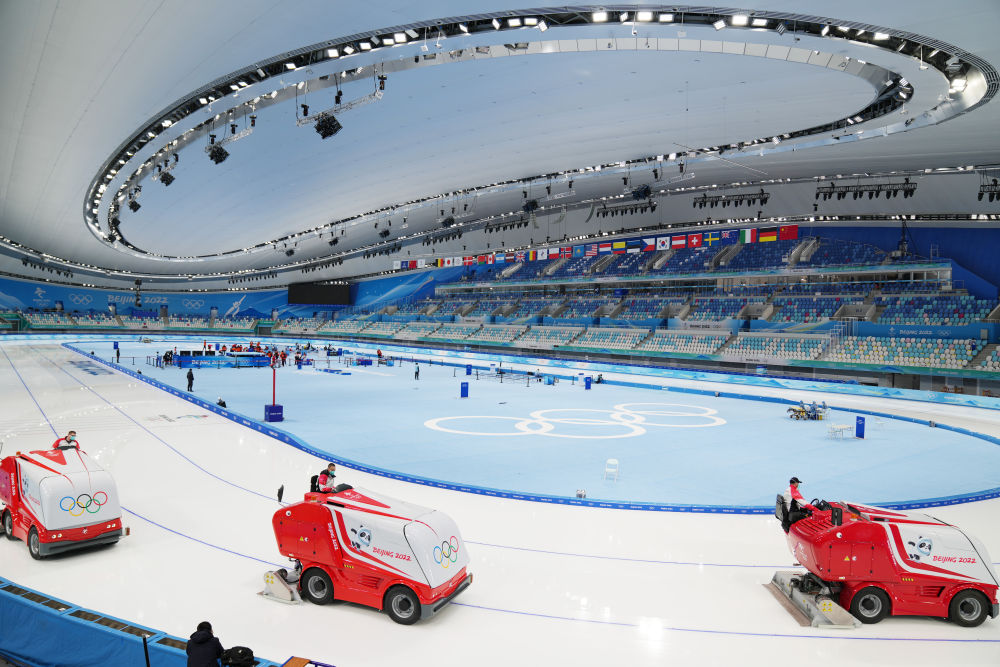 澆冰車在國家速滑館“冰絲帶”作業(yè)。被稱贊為“最快的冰”的“冰絲帶”在北京冬奧會期間見證多項紀錄誕生。