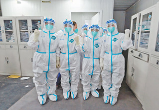 4月8日晚,隨著海南省援滬醫療隊近百名醫護人員的進駐,上海嘉定南翔方艙醫院正式投入運行。圖為醫護人員在入艙前加油鼓勁。 新華社記者 李 賀攝