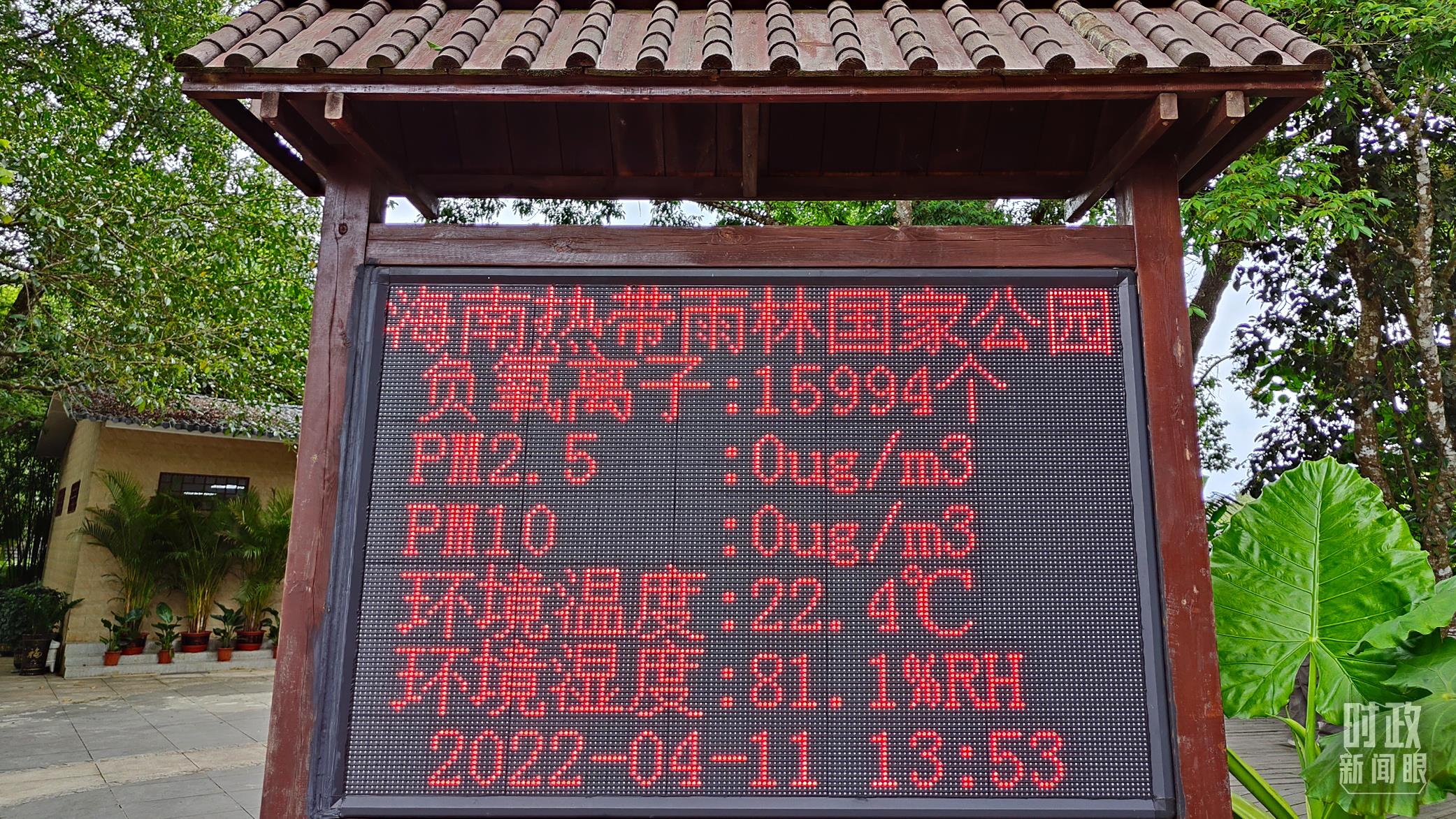 △海南熱帶雨林國(guó)家公園的電子屏顯示實(shí)時(shí)環(huán)境質(zhì)量指數(shù)。(總臺(tái)央視記者楊立峰拍攝)