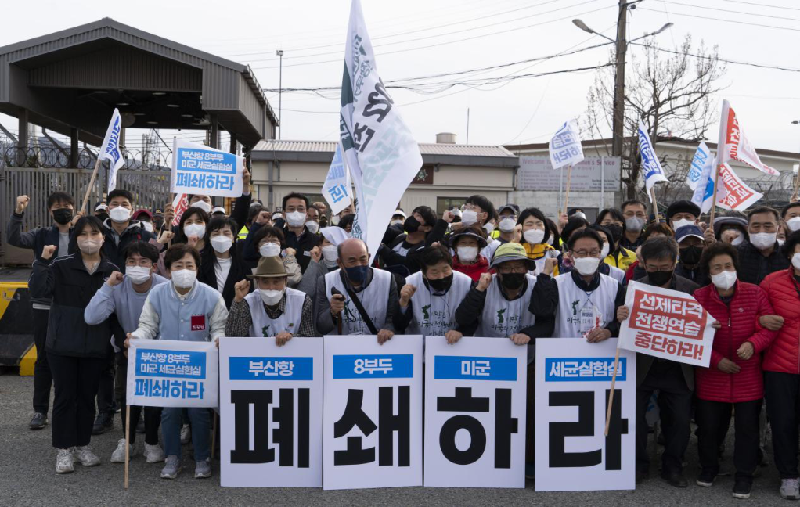 2022年4月5日,韓國民間團體在位于韓國釜山的美軍基地附近游行示威,呼吁停止韓美聯合軍事演習,要求關閉釜山港美軍基地內的生物實驗設施。李相浩攝