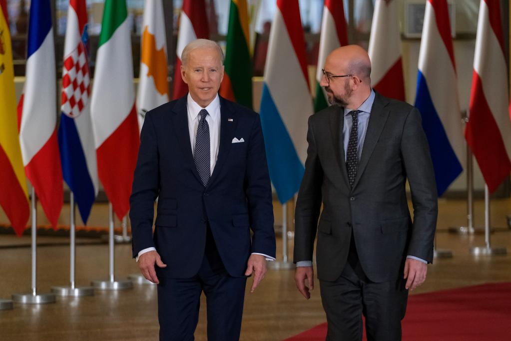 3月24日,美國總統拜登(左)和歐洲理事會主席米歇爾抵達歐盟總部。正在布魯塞爾訪問的美國總統拜登24日說,他支持將俄羅斯排除在二十國集團之外。拜登當天抵達布魯塞爾,出席北約、七國集團和歐盟三場峰會。他在北約總部召開的記者會上說,如果二十國集團不排除俄羅斯,至少也應邀請烏克蘭參加會議。新華社記者張鋮攝