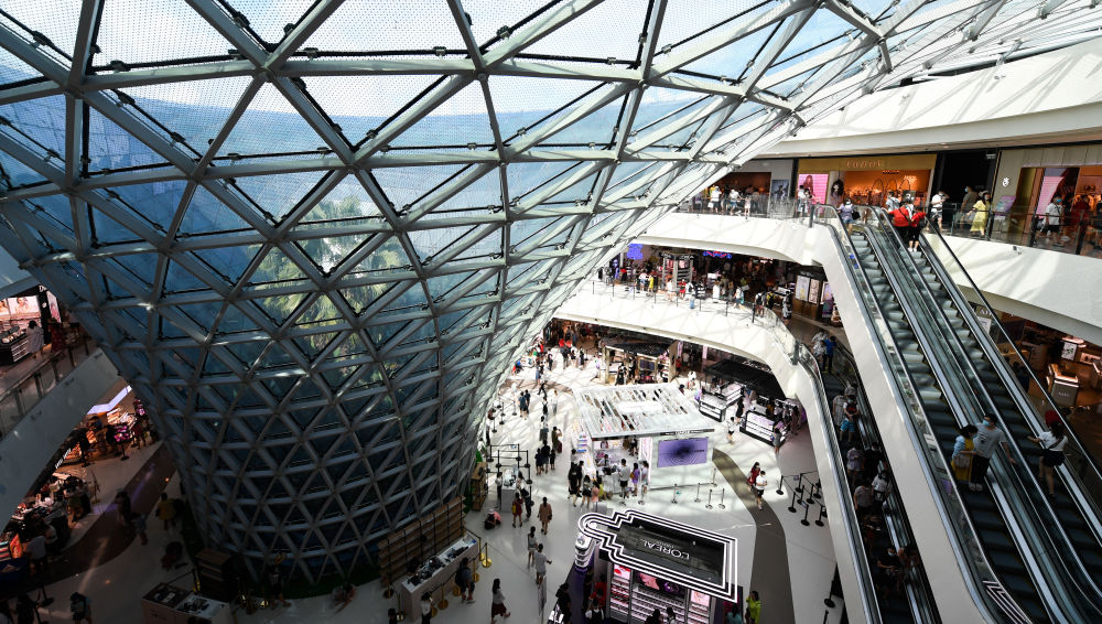 ↑游客在三亞國際免稅城購物(2020年8月6日攝)。