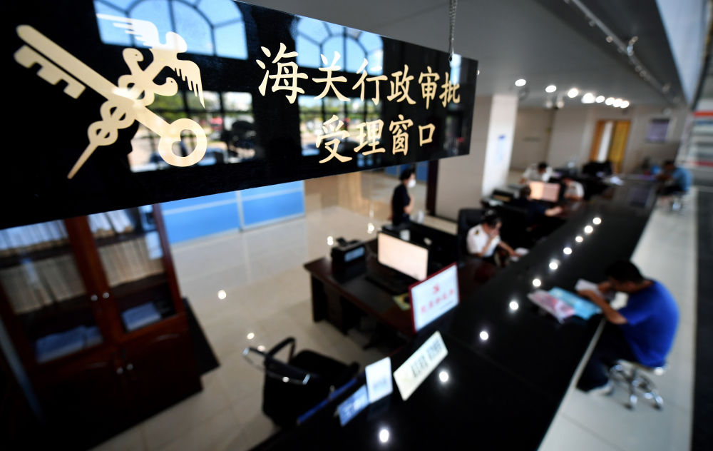 ↑2021年5月26日,工作人員在海口綜合保稅區政務服務中心辦理報關業務。