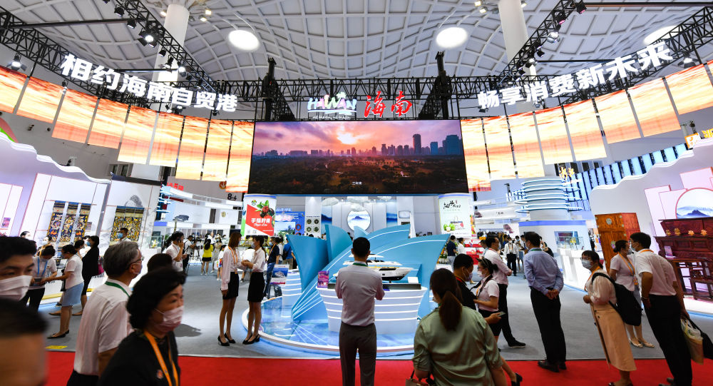 ↑2021年5月7日,在海南省海口市,參觀者在首屆中國國際消費品博覽會上參觀。