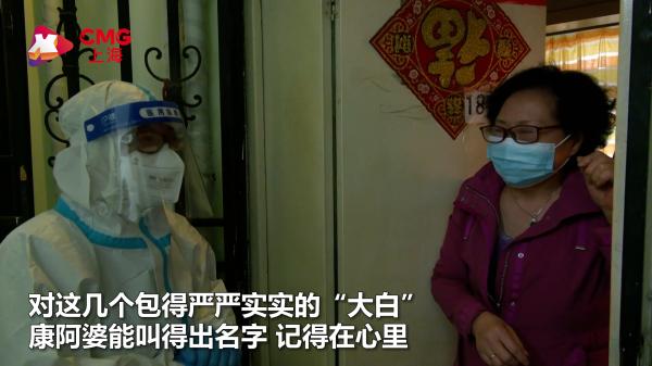 住在四樓的康阿婆已經80多歲了,她是一位獨居老人,家人不在身邊。陳瑜時不時要過來送蔬菜、問問情況,有時就是來聊聊天。康阿婆對包得嚴嚴實實的幾個“大白”都能叫得出名字。