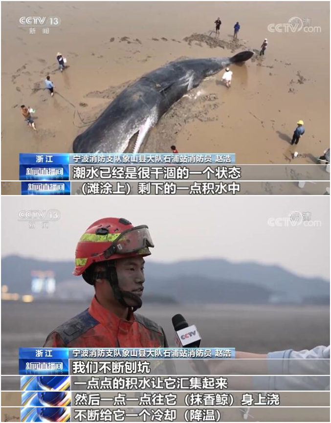 這頭抹香鯨被發現時大半個身軀還是被海水淹沒的,尾部不斷地拍打著海水。救援人員趕到現場后,曾試圖利用漁政船和漁船將抹香鯨拖進深海,但沒能成功。下午2時左右,這頭近20米長的抹香鯨已經幾乎完全裸露在灘涂上,體力耗盡加上皮膚長時間暴露導致脫水,情況非常危險。