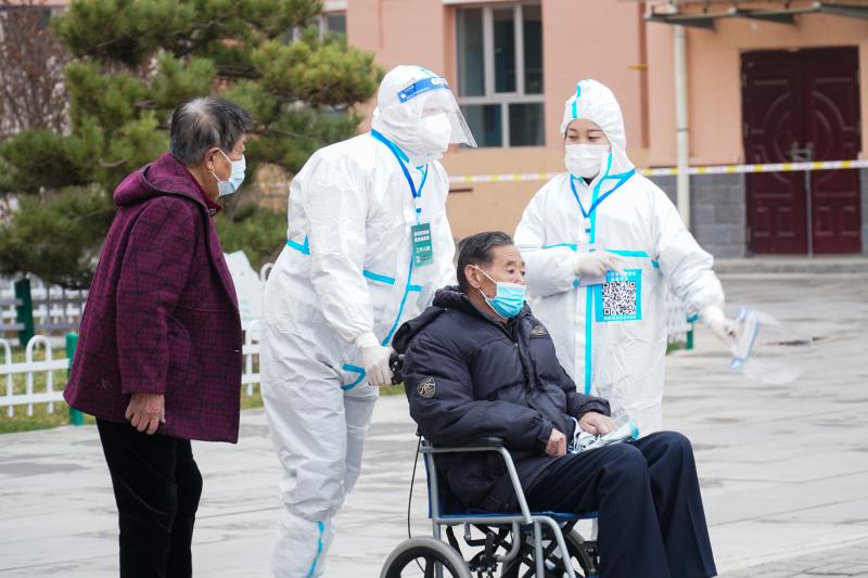 4月15日,在青海省西寧市城西區一處核酸檢測采樣點,防疫工作人員為行動不便的老人開通“綠色通道”,方便他們完成核酸采樣。(新華社記者 張子琪 攝)