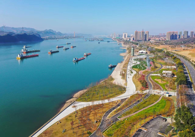 2022年4月19日,拍攝于湖北省宜昌市猇亭區8公里長江岸線,建成后的猇亭區沿江護岸如詩如畫。宜昌市委宣傳部供圖