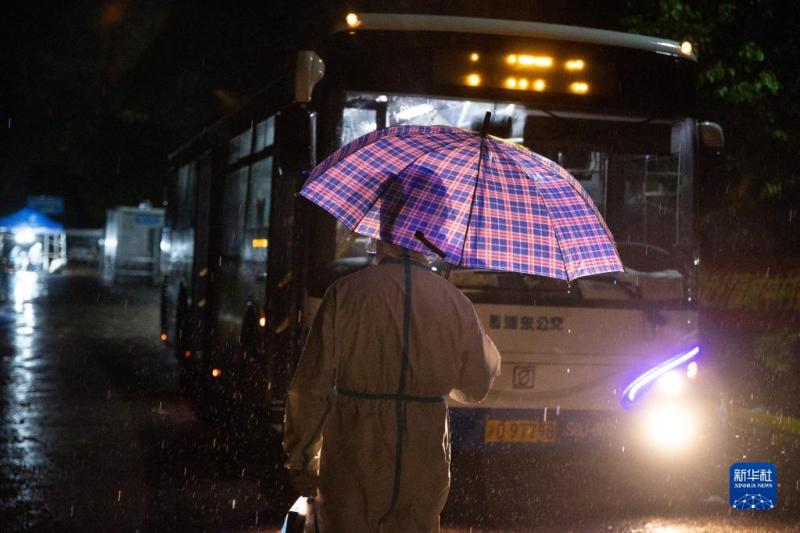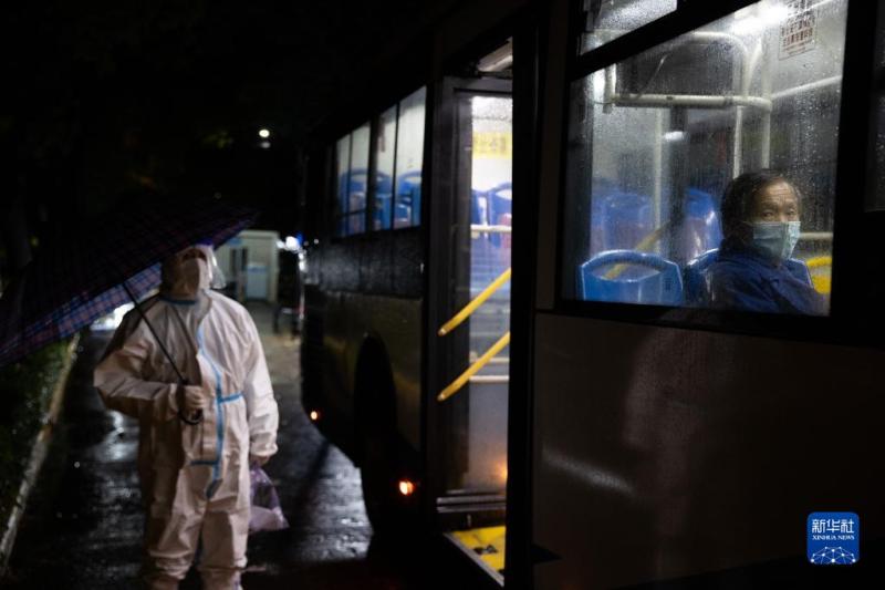4月28日,在上海浦東北蔡鎮聯勤村村口,志愿者站在雨中等待轉運的密接者上車。