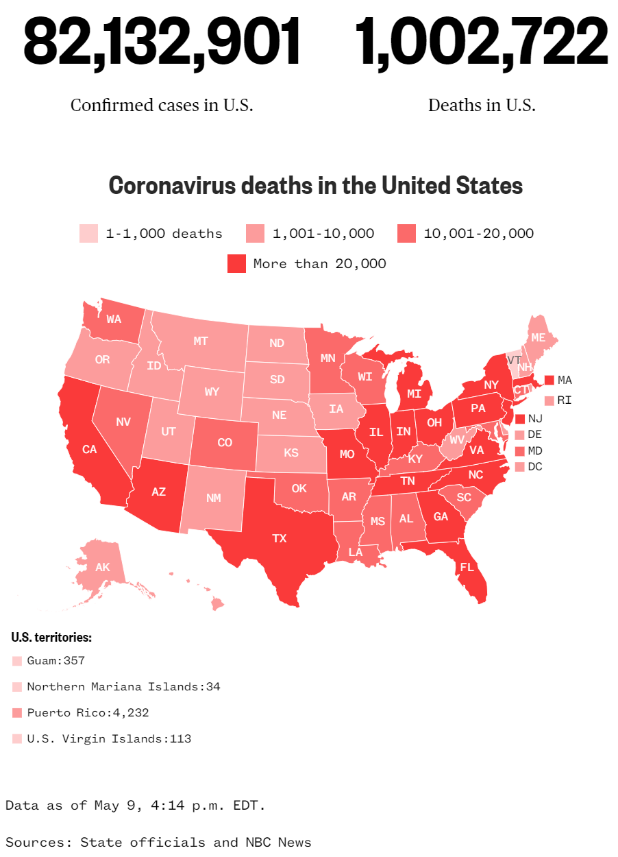 中國日報網5月10日電 據美國國家廣播公司(NBC)近日報道,美國新冠肺炎死亡人數已超100萬。盡管這個國家早已創下疫情死亡人數的最高紀錄,這個數字仍是不可想象的,它相當于美國第十大城市加利福尼亞州圣何塞市的人口數。自27個月前美國確診首個新冠病例后,死亡人數就以驚人的速度攀升。