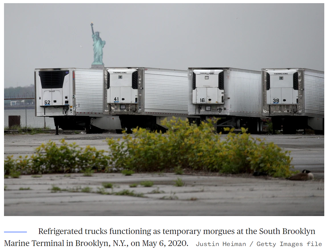 在紐約布魯克林的南布魯克林海運碼頭,冷藏車充當臨時停尸房。2020年5月6日
