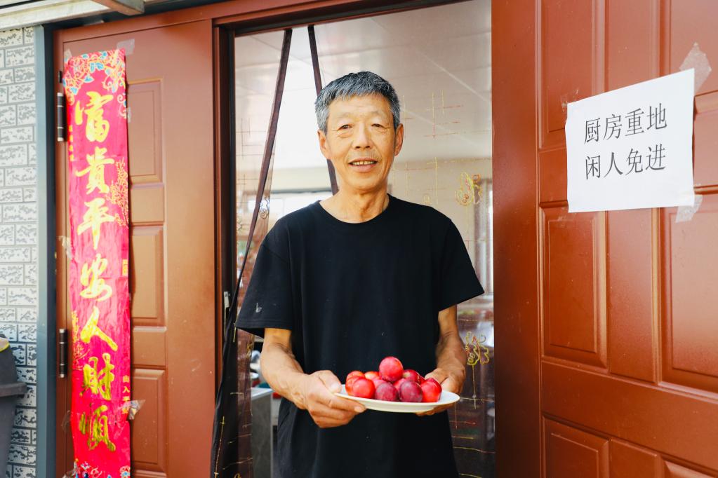林場退休職工劉養順在農家樂招待客人(2021年7月22日攝)。新華社記者孫曉宇 攝
