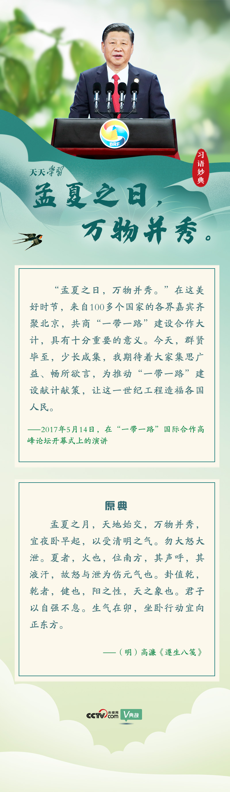 2017年5月14日,習(xí)近平主席在北京出席“一帶一路”國際合作高峰論壇開幕式,并發(fā)表題為《攜手推進(jìn)“一帶一路”建設(shè)》的主旨演講。開幕式當(dāng)天是農(nóng)歷四月十九日,適值“孟夏之日”。此時(shí)的北京初夏剛至,風(fēng)暖晝長,陽光明媚,藍(lán)天、白云、山水和古建筑相映成趣,大地郁郁蔥蔥,一片生機(jī)盎然。在演講開場白中,習(xí)近平主席將古人成句“孟夏之月,萬物并秀”信手拈來,易“月”為“日”,與眼前萬物勃發(fā)、生機(jī)盎然的京城美景相呼應(yīng),也讓與會嘉賓們感受到中國人民的熱情,堪稱妙用天成。