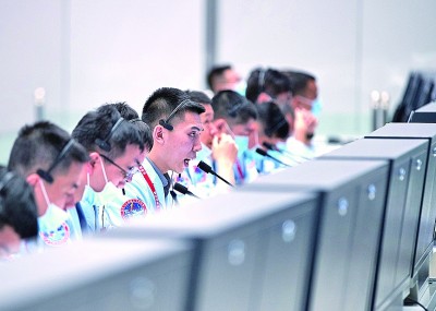 2021年6月17日,在北京航天飛行控制中心,科研人員在監測神舟十二號載人飛船與天和核心艙自主快速交會對接情況。新華社發