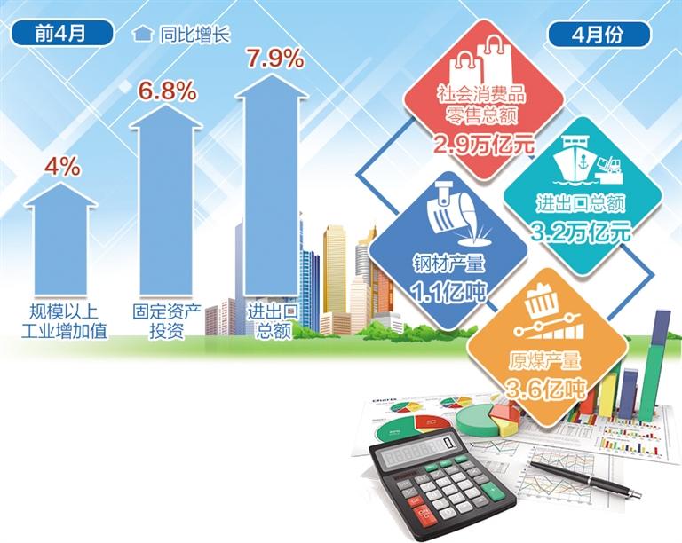 4月份,社會消費品零售總額達2.9萬億元,進出口總額達3.2萬億元。從累計看,全國主要指標仍保持增長。前4月規模以上工業增加值同比增長4%,固定資產投資和進出口總額分別增長6.8%和7.9%。