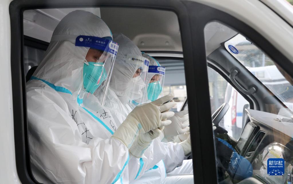 河南省援滬醫療轉運隊隊員趙鵬、王小光和海威(由近到遠)在急救車上查看手機上的轉運任務信息和規劃行車路線(5月8日攝)。新華社記者 方喆 攝