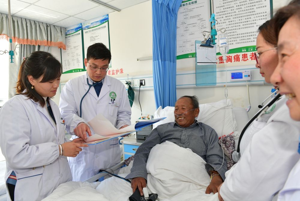 在西藏山南市人民醫院,來自安徽的援藏醫生梁有峰(左二)帶領醫生們查房。“組團式”醫療援藏提升了山南市醫療水平(2019年4月24日攝)。