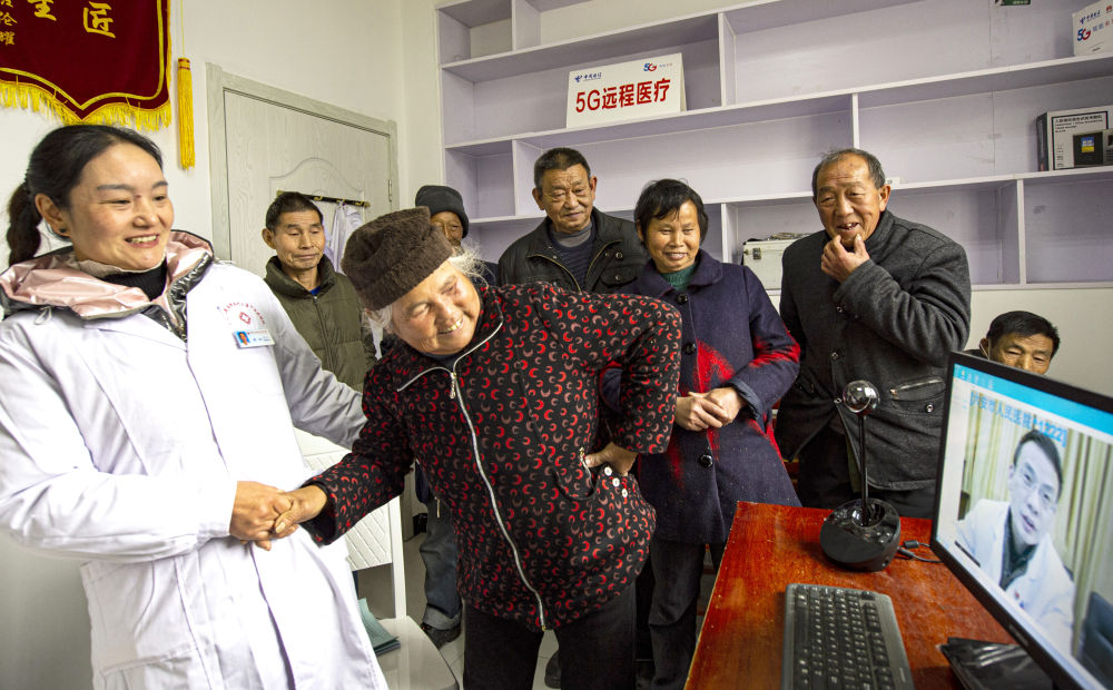 安徽金寨縣大灣村村民方臨芳(前右)指著自己身體疼痛的部位,在村醫袁玲(前左)的幫助下向通過5G網絡遠程醫療會診的專家講述病情。“互聯網+醫療”讓村民在“家門口”也能享受專家診療(2020年12月3日攝)。
