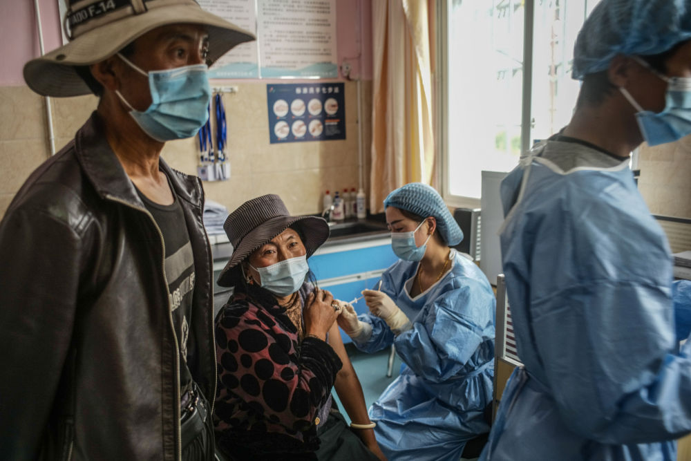 在四川甘孜州稻城縣疫苗接種點,當地群眾在接種新冠病毒疫苗。這批疫苗經過三天冷鏈運輸,從北京送到2000多公里以外的稻城,保證當地群眾接種(2021年7月24日攝)。