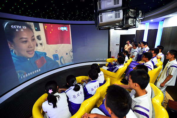 圖為2013年6月20日,在南開中學(xué)航天體驗(yàn)館,學(xué)生們通過弧形屏幕觀看中國(guó)首次太空授課。
