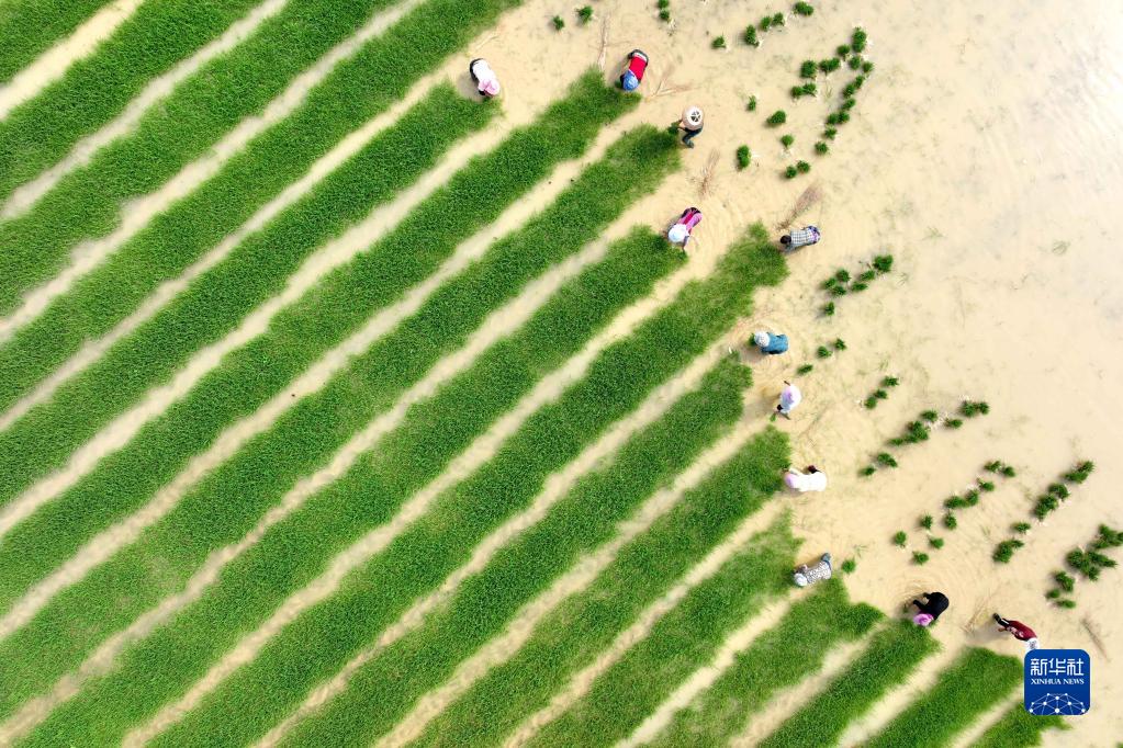 6月7日,村民在貴州省黔東南苗族侗族自治州岑鞏縣大有鎮(zhèn)臘恰畈村整理秧苗(無(wú)人機(jī)照片)。