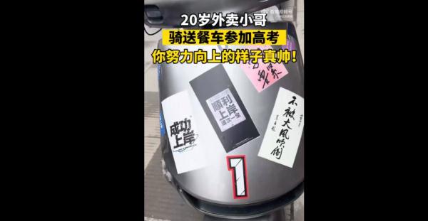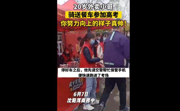 外賣小哥騎送餐車參加高考