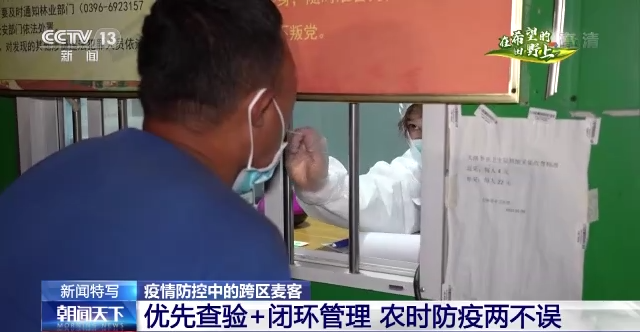 晚上10點(diǎn)多,來自黑龍江佳木斯的機(jī)手孔德寶和老鄉(xiāng)田佰良,在完成信陽息縣的收割后,拉著兩臺收割機(jī)趕到了上蔡縣,要按一位用戶發(fā)來的定位去往麥?zhǔn)盏攸c(diǎn)。駐馬店上蔡縣是河南的種糧大縣,小麥種植面積146萬畝。6月1日前后,上蔡縣的小麥進(jìn)入大面積的收割時段,3000多臺跨區(qū)作業(yè)的收割機(jī)云集上蔡參加搶收。持有跨區(qū)作業(yè)證的孔德寶和老鄉(xiāng)田佰良,在農(nóng)機(jī)轉(zhuǎn)運(yùn)綠色通道服務(wù)站點(diǎn),接受免費(fèi)落地核酸檢測。