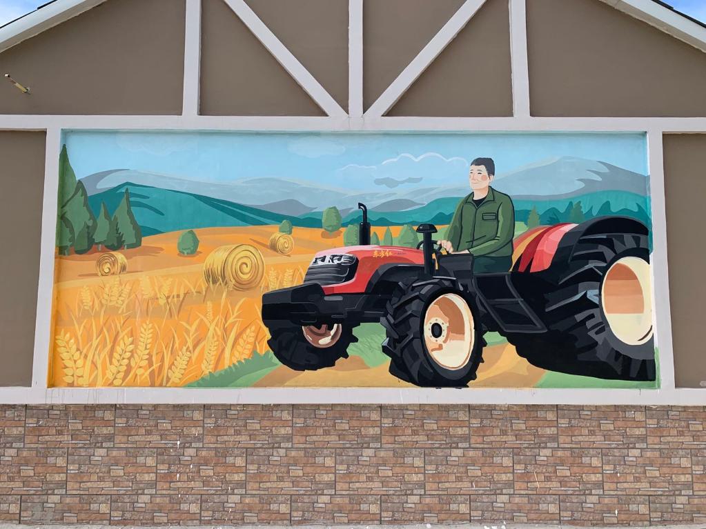 在西口村易地扶貧搬遷小區(qū)3棟1號(hào)房屋山墻上,有一幅色彩絢麗、描繪豐收的墻繪