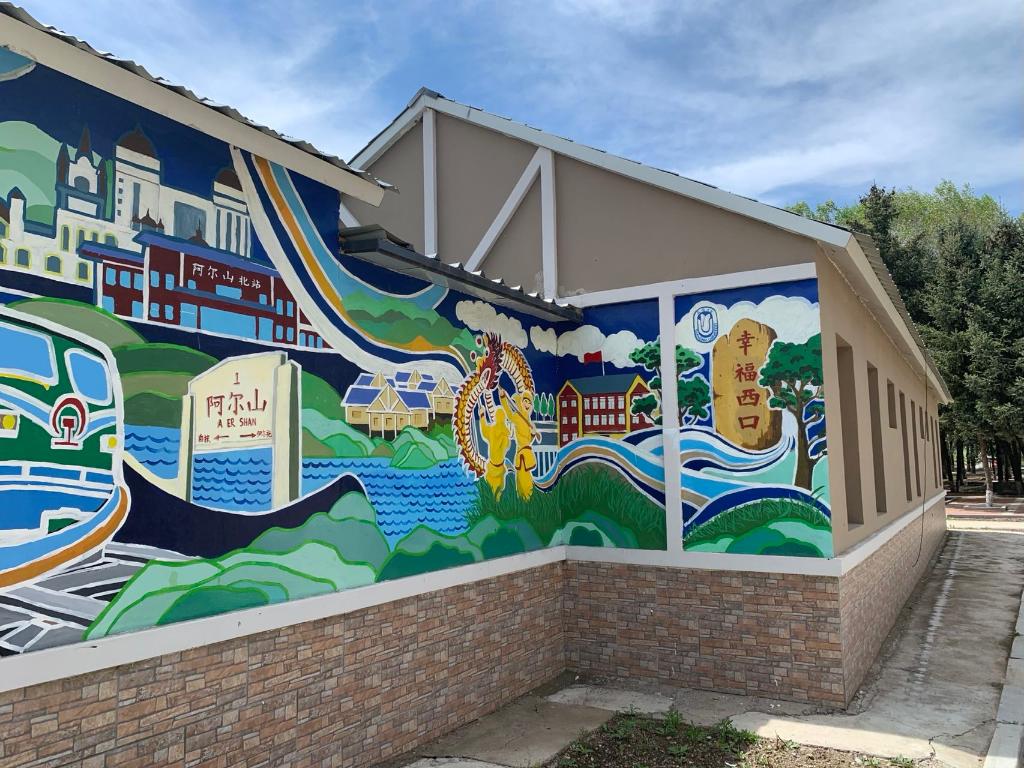 在西口村黨群服務(wù)中心,幾十面墻壁滿是各色墻繪,艷麗而靈動(dòng),灰頭土臉的老房子一下“活”了起來(lái)。這些作品都是近幾年創(chuàng)作的。尤其在2021年,西口村舉行了第一屆阿爾山市鄉(xiāng)村墻繪藝術(shù)大賽,上海大學(xué)上海美術(shù)學(xué)院、浙江藝術(shù)職業(yè)學(xué)院、廣州美術(shù)學(xué)院附中等8所院校,近千人次來(lái)到西口村,長(zhǎng)達(dá)數(shù)月進(jìn)行墻繪創(chuàng)作,總創(chuàng)作面積超1000平方米。