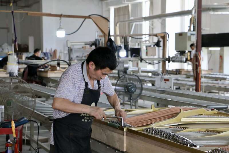 6月21日,東衡村鋼琴眾創園的工人在為鋼琴掛弦。新華社記者 王聿昊 攝