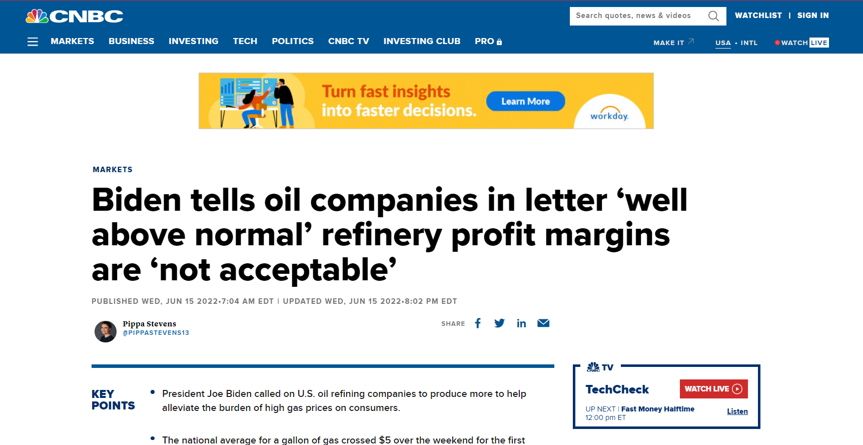 美國總統(tǒng)拜登此前已多次抨擊石油公司從燃料供應(yīng)緊張的局面中攫取了巨額利潤。他在上周發(fā)給美國七家主要煉油企業(yè)的信中寫道:“在戰(zhàn)爭時(shí)期,煉油廠的利潤率遠(yuǎn)遠(yuǎn)高于正常水平,而企業(yè)將代價(jià)直接轉(zhuǎn)嫁給美國人民,這是不可接受的。”