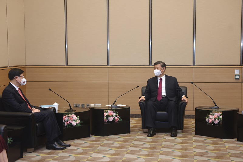7月1日上午,國家主席習近平在香港會見剛剛就職的香港特別行政區(qū)行政長官李家超。新華社記者 鞠鵬 攝