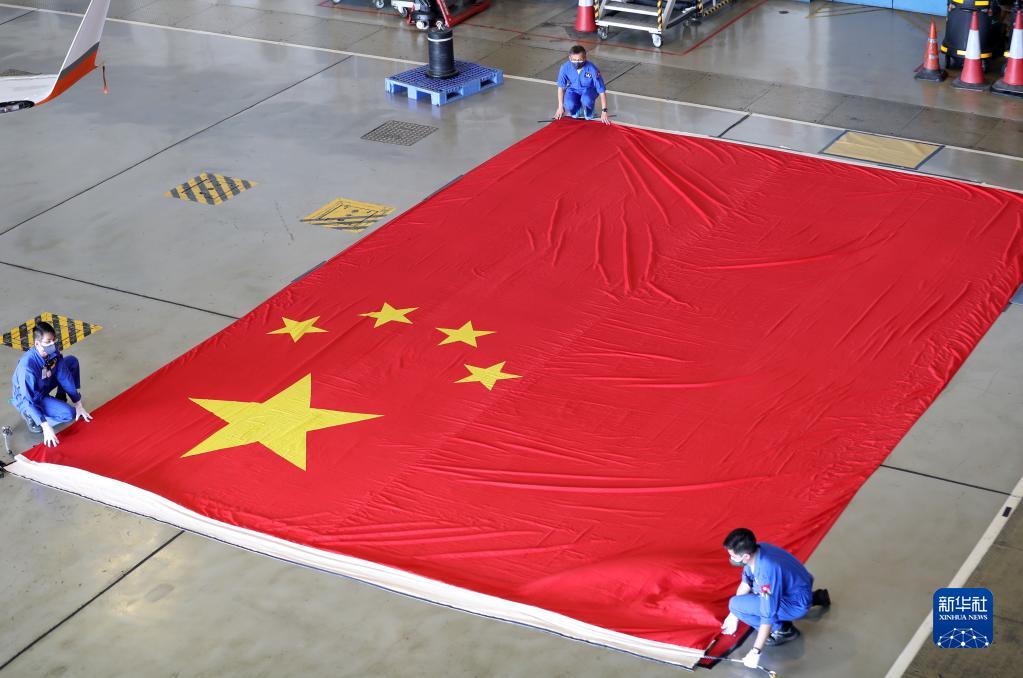 直升機(jī)務(wù)教官蔡澤民套上鞋套,戴上白手套,拿著夾有《國(guó)旗及國(guó)徽條例》的文件夾,一一對(duì)照檢查。國(guó)旗是在具備資質(zhì)的廠家專門定制的,規(guī)格規(guī)范都有嚴(yán)格要求。國(guó)旗大,就有拼接。蔡澤民主要查看色澤是否飽滿和均勻,接縫是否平整,四條邊上有沒有線頭等,特別要注意的是,五顆星星處不可有接縫。一番操作下來(lái),后背已然濕透。