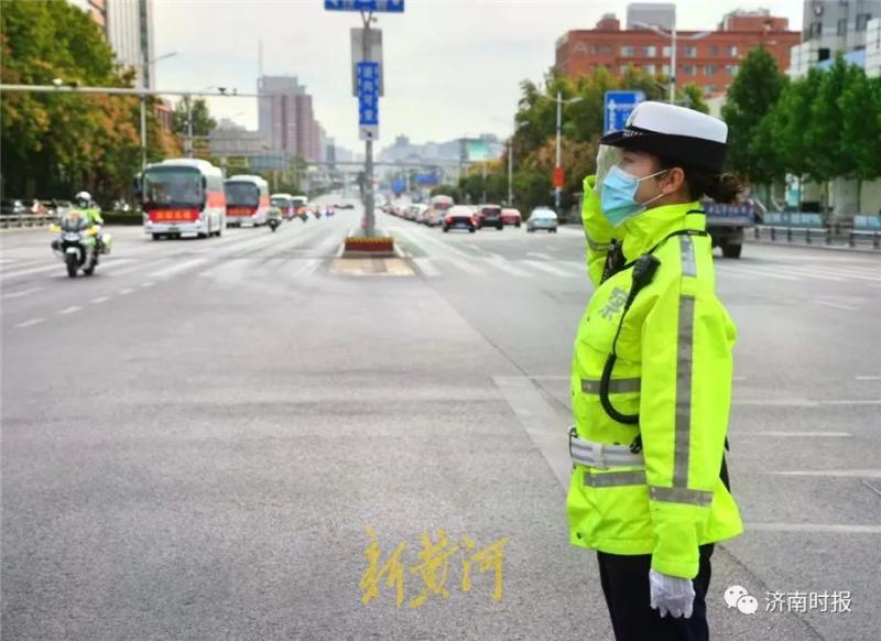 車隊在經十路上行駛,執勤交警面向車隊敬禮。