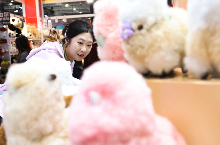 2025年11月8日,在第八屆進博會消費品展區,參觀者在秘魯溫暖駝品牌的羊駝毛制品前駐足觀看。新華社記者 方喆 攝