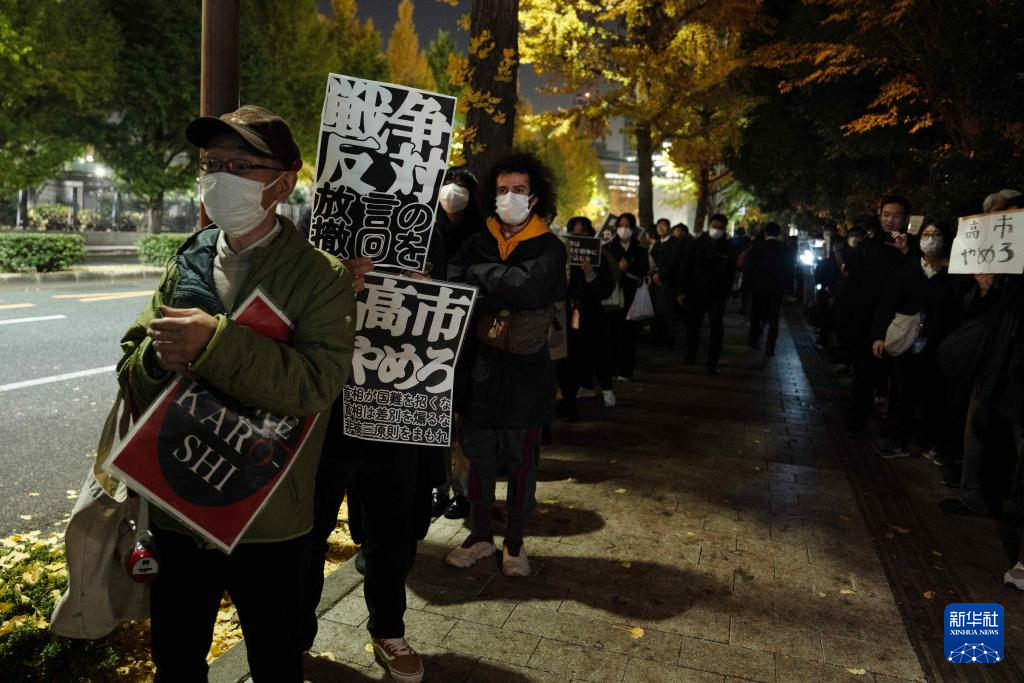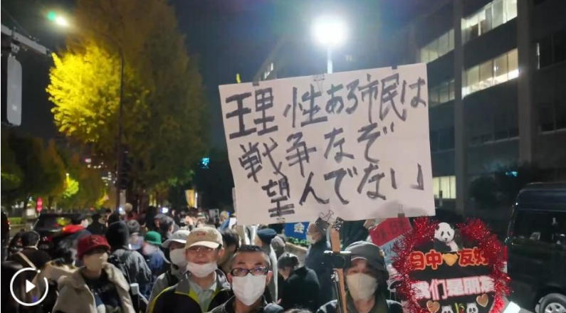 集會(huì)定于當(dāng)?shù)貢r(shí)間20時(shí)開始。19時(shí)前后,便有民眾陸續(xù)趕到現(xiàn)場(chǎng)。抗議者們舉著寫有“撤回言論 反對(duì)戰(zhàn)爭”“因高市才有事”“高市下臺(tái)”等標(biāo)語的牌子,高喊“禁止軍國主義復(fù)燃”等口號(hào)。多名抗議者要求高市對(duì)其涉臺(tái)言論負(fù)責(zé)并辭去首相職務(wù)。