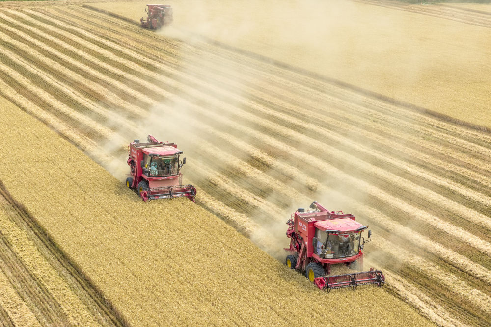 2025年6月9日,河南省三門峽靈寶市西閻鄉東古驛村村民在搶收小麥(無人機照片)。新華社發(杜杰 攝)