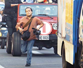 馬英九昨天上午陪國(guó)民黨“立委”候選人掃街拜票,香港記者李東杰搶拍完畫(huà)面,跑步追趕已向前行進(jìn)的采訪車(chē)。(聯(lián)合報(bào)圖)