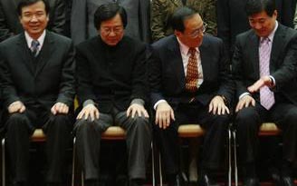 臺(tái)當(dāng)局“行政院長(zhǎng)”張俊雄(右二)率總辭后的全體“閣員”拍畢業(yè)照留念。臺(tái)灣“中央社”記者蘇圣斌攝
