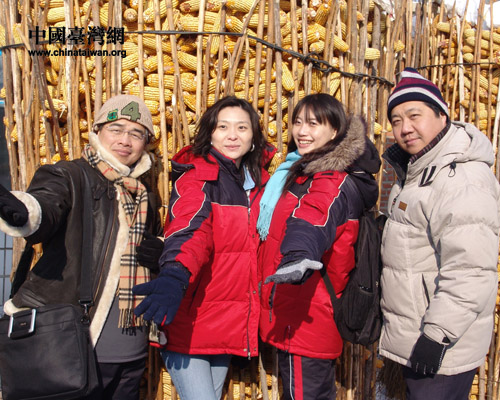 采訪第二天,兩岸媒體人走進(jìn)滿族鄉(xiāng)寶山村農(nóng)家院。玉米堆前合張影,紅紅火火又一年